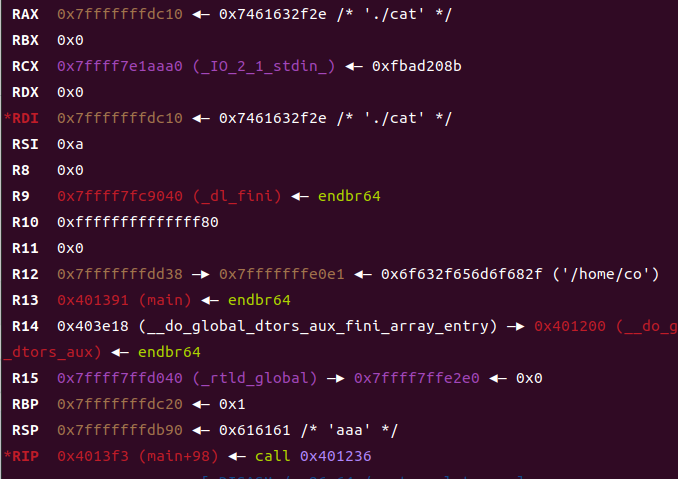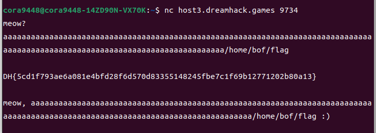 128๋ฐ์ดํธ ์ดํ ๋ฌธ์์ด๋ถํฐ๋ bof๋ก ์ธํด ./cat์ด๋ผ๋ ๋ฌธ์์ด์ด ์กด์ฌํ๋ ์์ญ์ ์นจ๋ฒํ ์ ์๊ณ