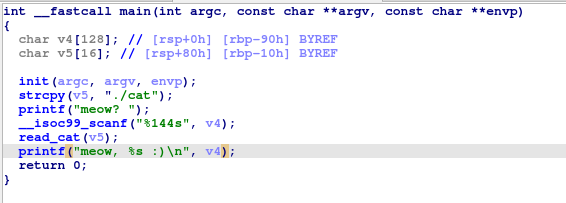 ์ฃผ์ด์ง ํ์ผ์ ์ด์ด๋ณด๋ฉด ./cat์ด๋ผ๋ ๋ฌธ์์ด์ด v5 ๋ณ์์ ๋ค์ด๊ฐ๋ค.