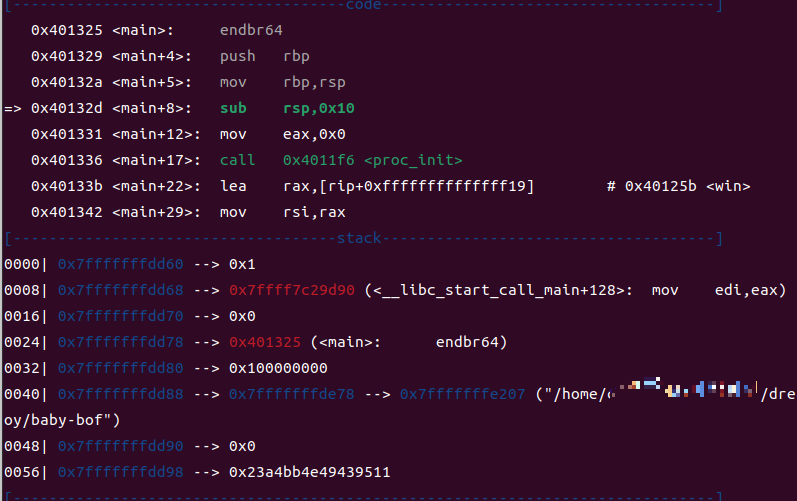 gdb로 run 한 다음 stack을 보면 0x7fffffffdd78에 main함수의 주소가 담겨있다. 따라서 해당 부분을 위에서 제공된 win 함수의 주소로 바꿔주면 해결할 수 있다.
