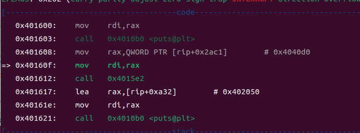 0x401603에서 puts함수를 call하고 여기서 아까 전에 실행했을때 나왔던 문자열이 출력된다.