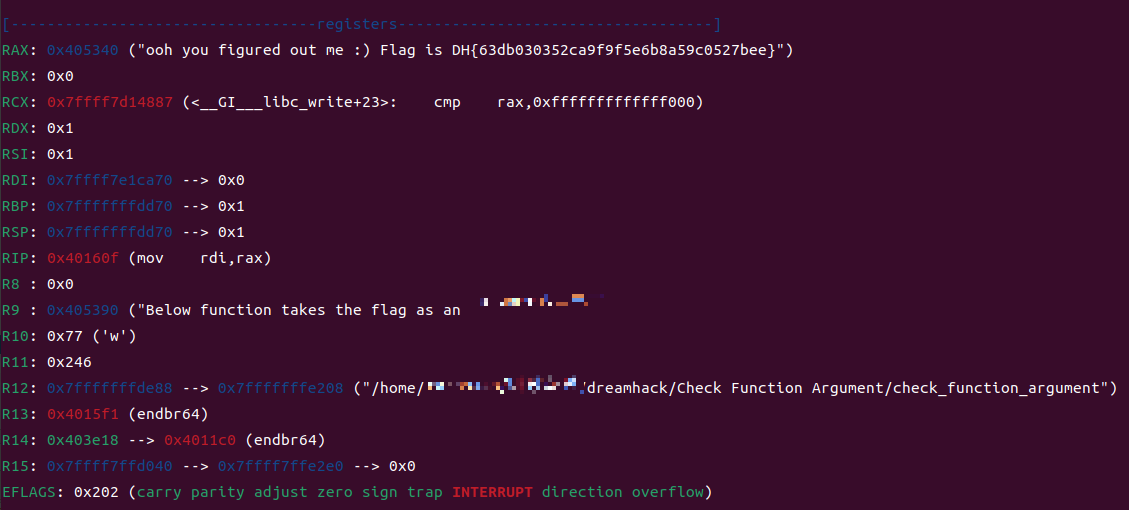 0x40160f에서 mov 명령어를 사용하는데, 이때 레지스터를 확인하면 다음과 같이 flag가 존재하는 것을 확인할 수 있다.
