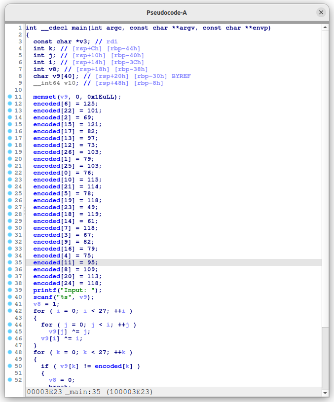f5눌러서 보니 c언어로 단순하게 encoded된 배열의 값을 scanf로 입력받은 값과 xor연산후 비교하는 코드로 보이는데