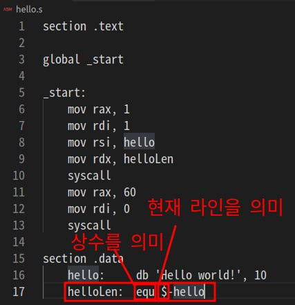 이어서, helloLen에는 equ(상수) $-hello는 현재 라인에서 hello의 라인 위치를 뺀 값을