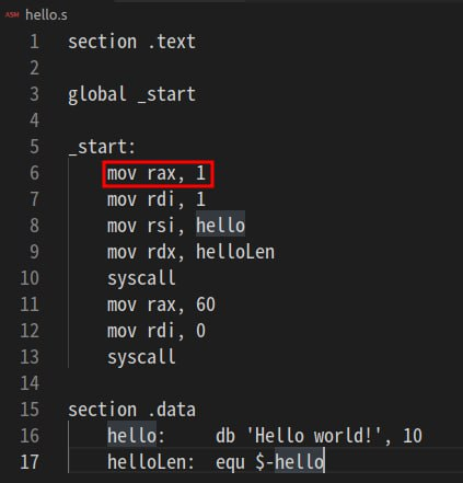 그래서 write를 호출하기 위해, rax에 1을 집어 넣는 것이다.