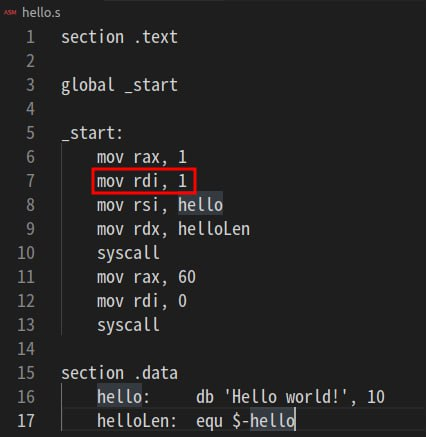 다시 위 사진을 봐보자, write 시스템 콜은 rdi 레지스터를 사용하는 인자를 첫 번째로 두고 있다.