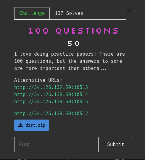 언뜻 봐선 파일에 이 코드가 있는데 일단 100개의 질문에 일치하는 답을 풀어야 flag를 얻을 수 있어보인다.