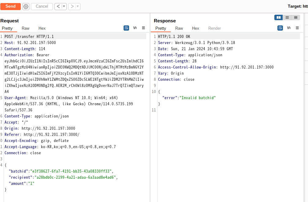 burp suite에서 송금하는 패킷을 딴 뒤에 repeater로 send만 여러번 눌러줘도 풀리는 어이없는(?) 문제였다.