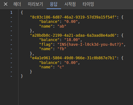 레컨을 통해 불린 금액으로 3개의 계좌 중 하나의 계좌에 13.37보다 많이 금액을 넣어주면 flag가 response에 포함되어 반환된다.